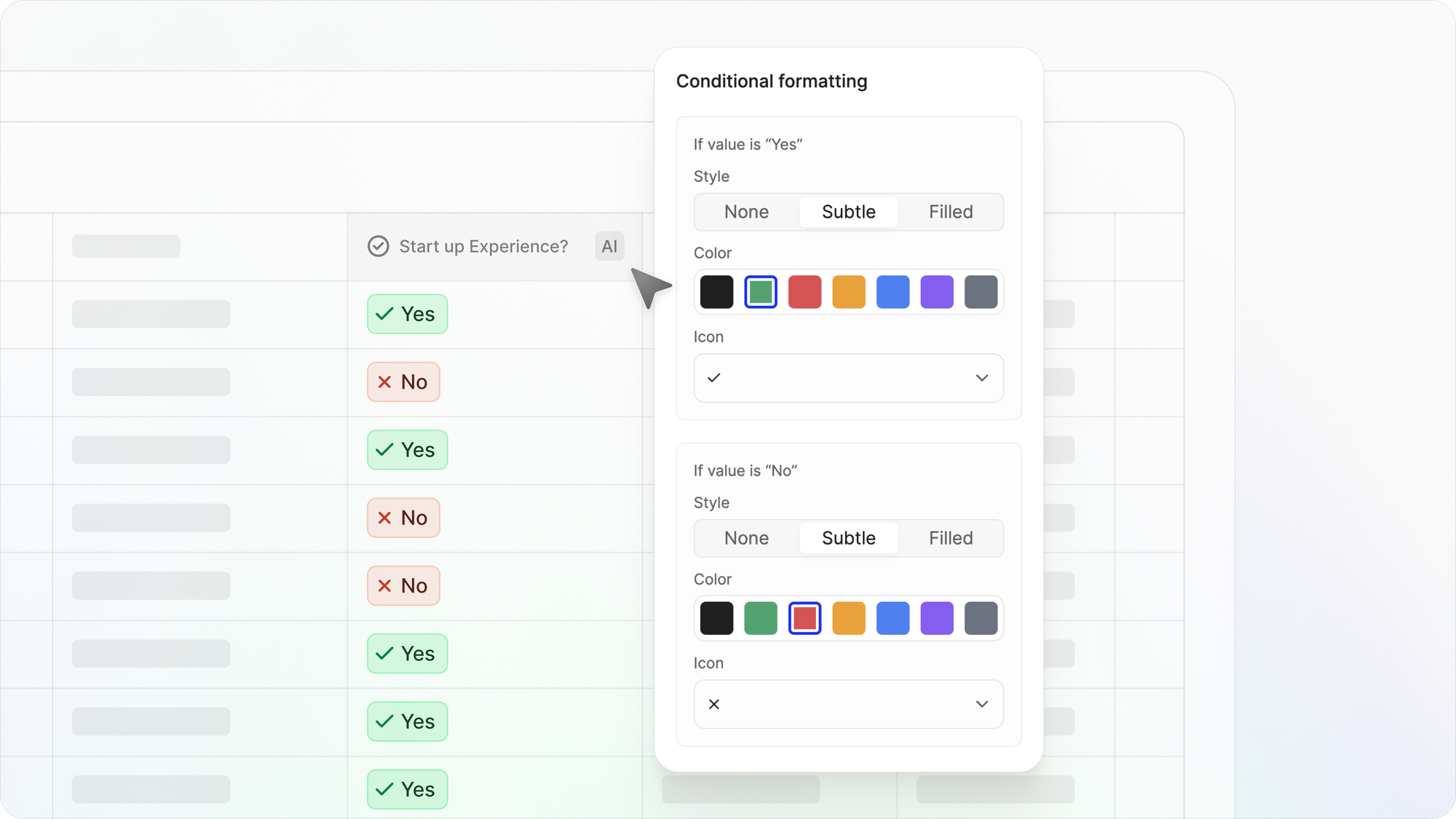 Formatting AI columns in Reports makes yes/no data impossible to miss. Automatically highlight critical signals—like marking “Yes” in red if a candidate needs relocation support—so the insights that matter jump off the page.