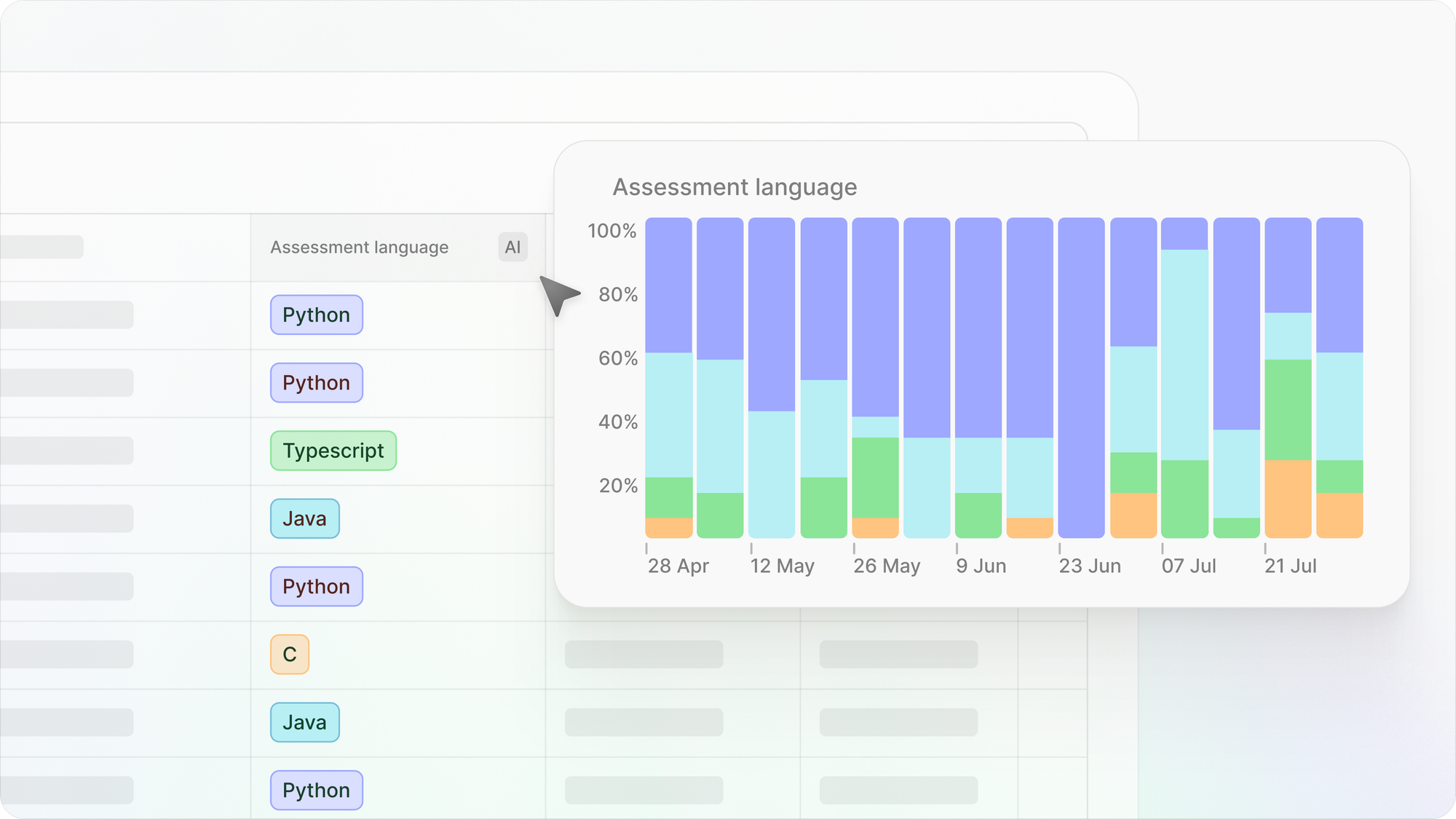 AI Column Charts let you plot conversation data in seconds, so you can spot trends at a glance. Visualize everything from candidate locations, their preferences for remote vs in-office, which programming languages come up most often, or compare responses across roles without extra analysis.