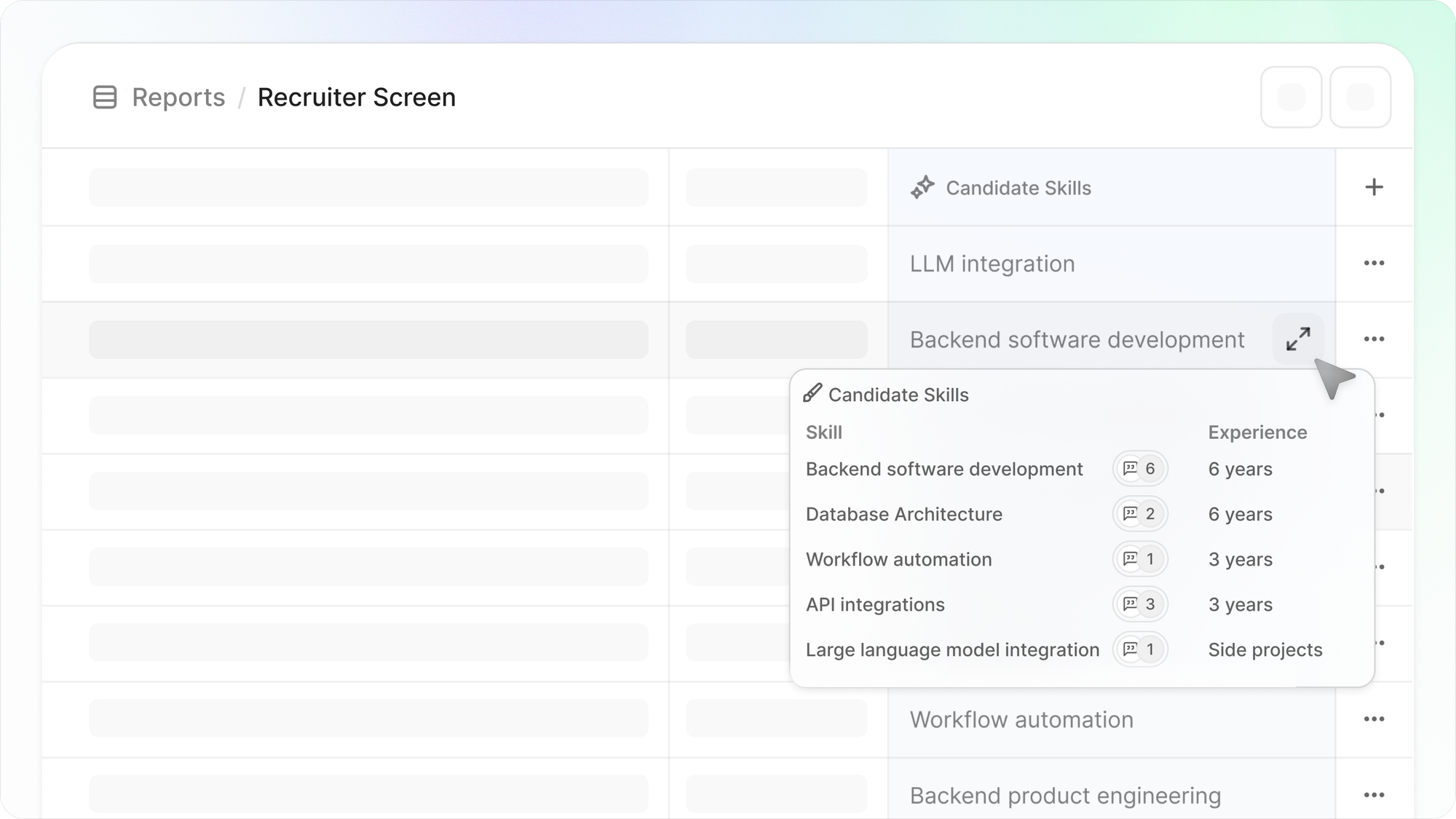 Our AI surfaces every skill mentioned in an interview, along with years of experience and references back to the transcript. These are then specifically flagged in the skills column.