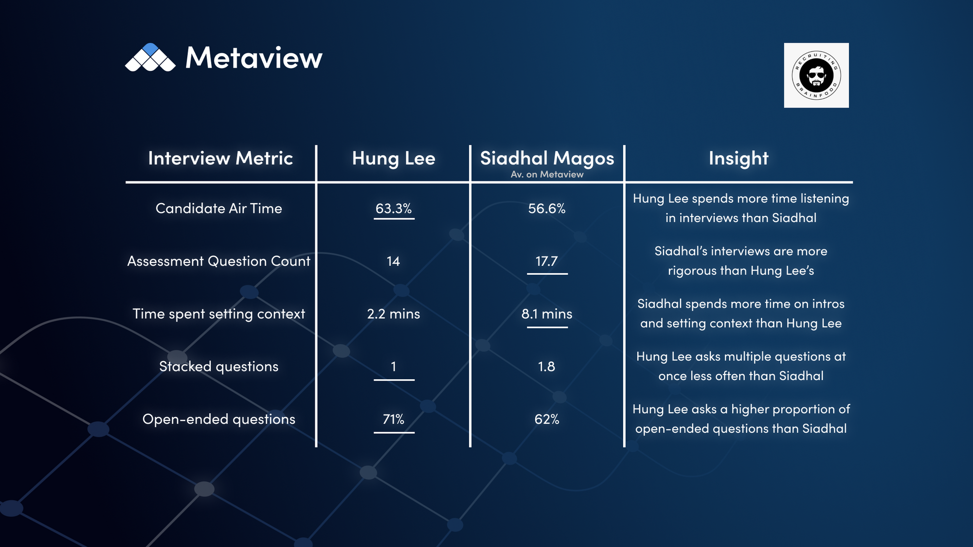 So, we ran the interview through Metaview's Interview Intelligence engine, and compared it Siadhal's own Interview Metrics on the platform. Here's what we learned: